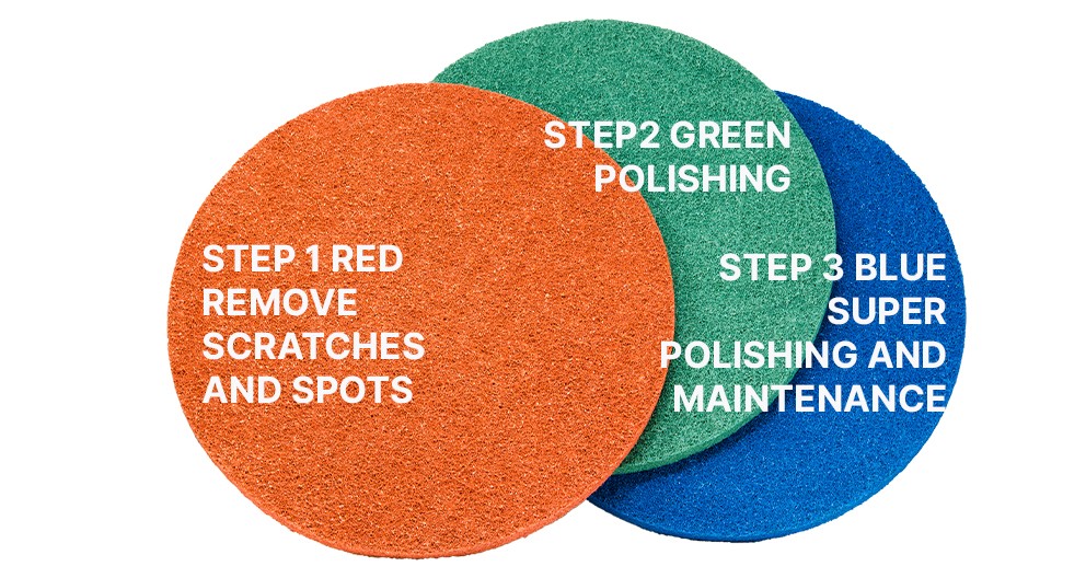 - Red Tripad (Step 1): Aggressive and efficient, the red pad tackles scratches, acid stains, and heavy dirt, delivering a solid 800-grit finish.