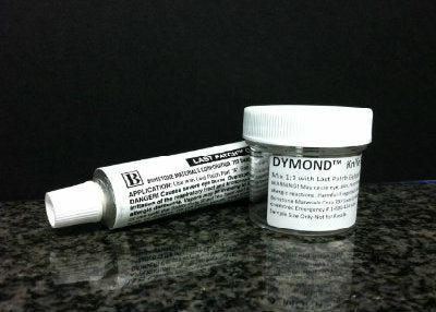 Last Patch™ Dymond is an exterior grade, UV stable stone repair compound for granite, marble, travertine and any other highly polished natural stone surface. Very fast (and adjustable) cure speed, excellent clarity, non-shrinkage, and extremely rapid hardness development make this product ideal for harder, glossier stones such as granite. And the resistance to sunlight sets Last Patch™ Dymond apart from all other products on the market. Available in pint or 2 oz sample kits. Mix ratio is 1:1. Set time is 10-20 minutes at 75 degrees. Can be tinted with liquid or powdered tints and stone dusts Sample kit contains 1 oz A and 1 oz Last Patch Gel B Pint kit contains 1 pint A and 14 1 oz tubes of Last Patch Gel B Applications: Aesthetic patches and repairs on fine grained stones For use indoors or outdoors Patching face pins on stone panels Crack repair from hairline to ¼ inch Surface patching to “Dutchman Joints” Monument repairs Building facade repairs, chips, spalls and sign hold repairs Floor and tile restoration Crack repair in stone panels and sills Patching exterior pavers and steps Benefits: Fast, hard & clear Color-less Will not stain white or light stones Forgiving mix ratio Non-shrinking Adjustable cure speed Knife-grade Polishable when fully cured Very fast setting UV stable – withstands sun exposure without discoloring Exceptional strength and durability Will cure at below-freezing temperatures with an accelerator Can be color matched