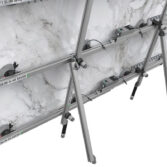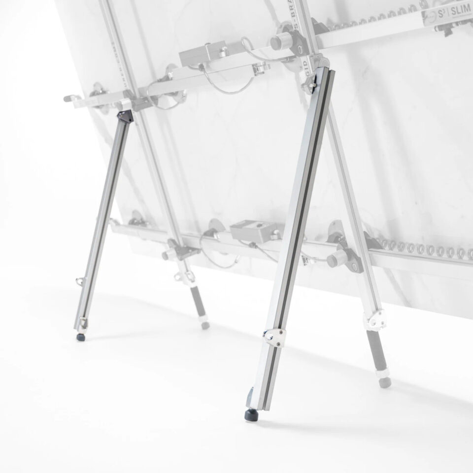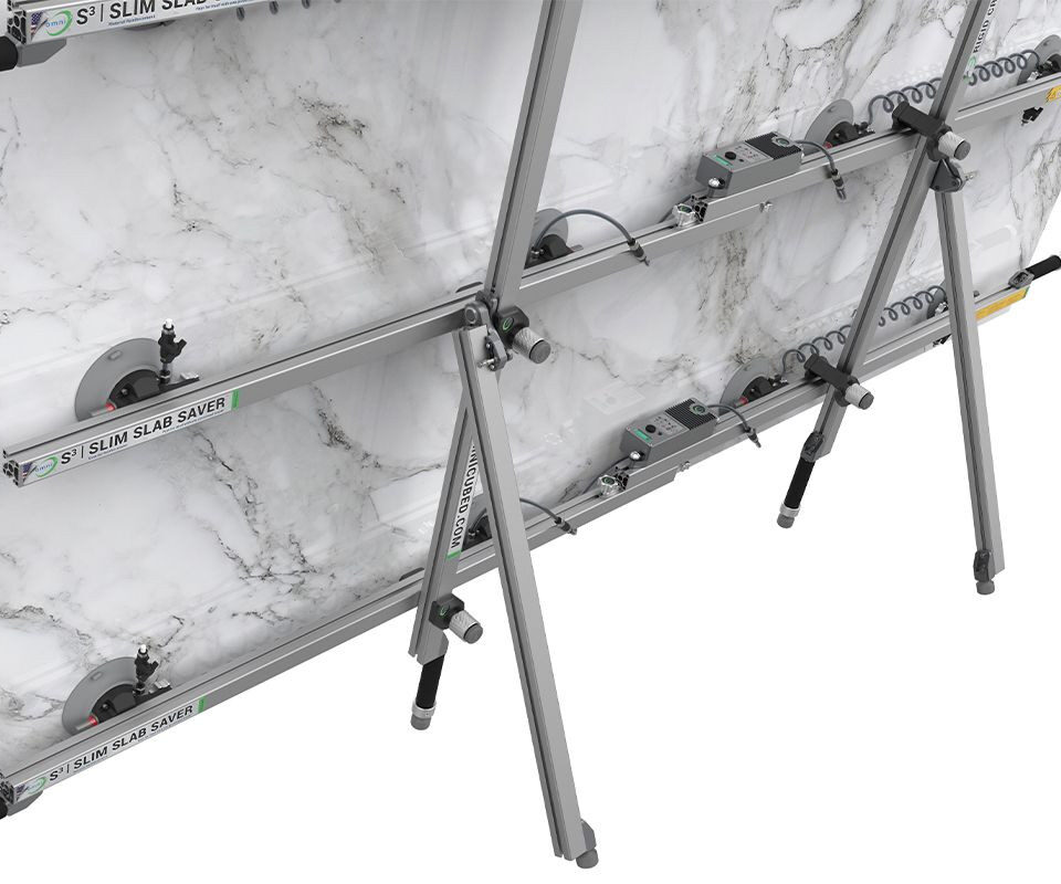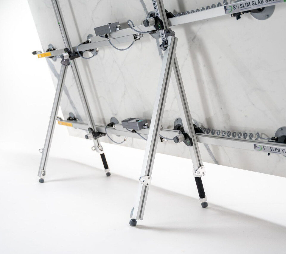 The Kickstand Kit includes a left and right kickstand designed for use with Omni Cubed’s Slim Slab Savers or vacuum cup Sink Hole Savers. It allows materials such as stone or tile to rest upright, providing a more ergonomic position for applying mortar or adhesive. Integrated PVC resting feet protect finished surfaces from scratches during use.