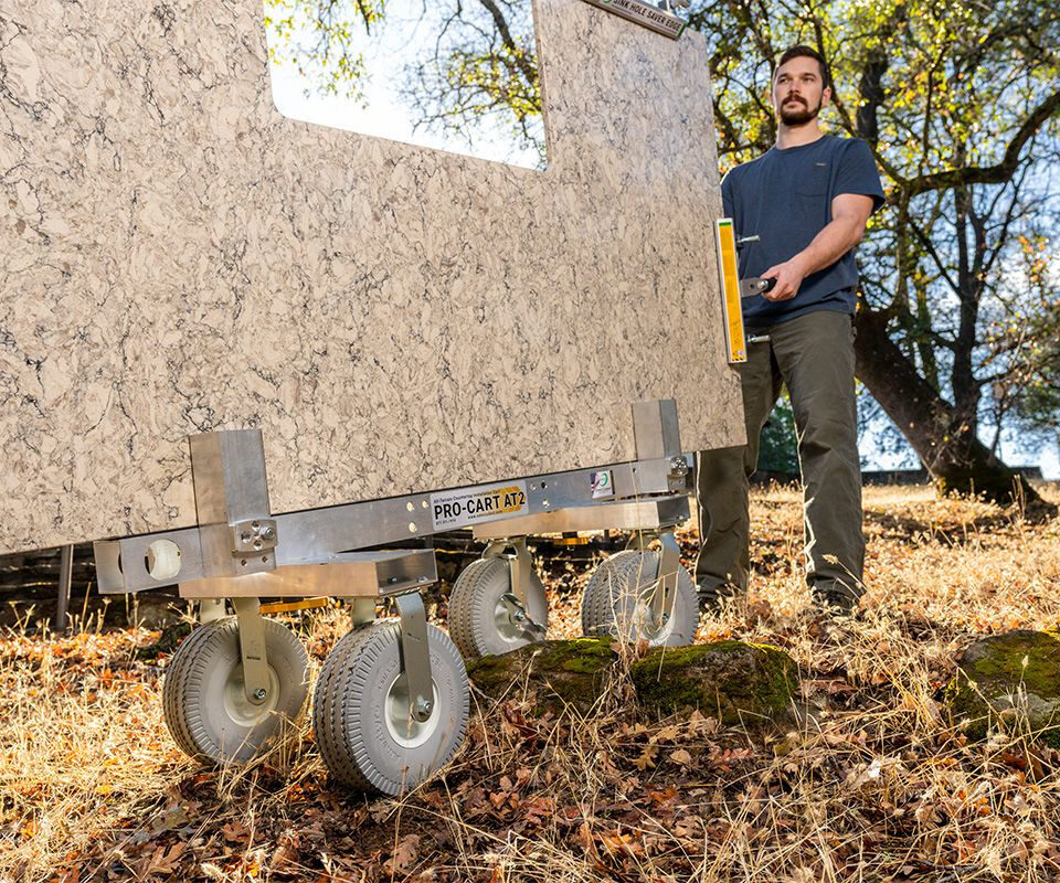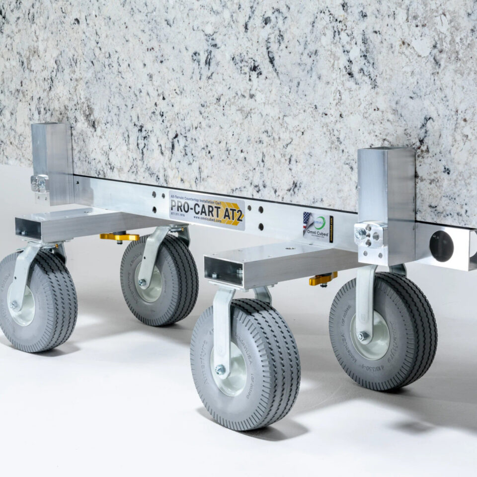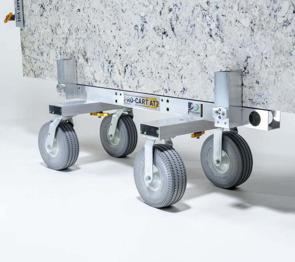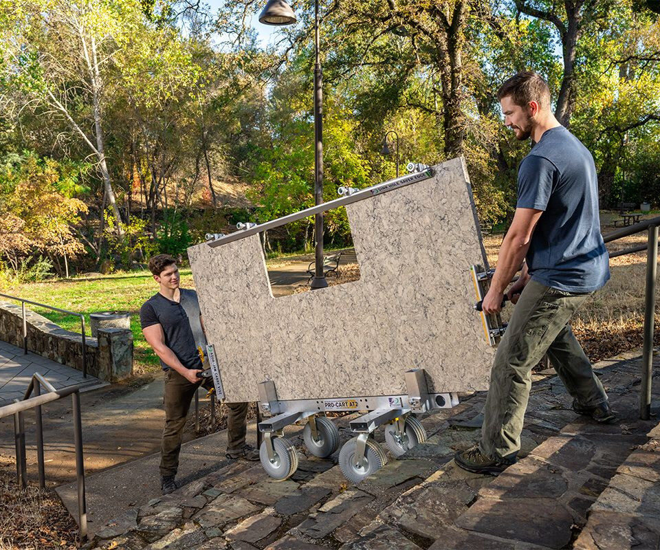 Conquer stairs, rough terrain, and challenging landscapes with ease using the Pro-Cart AT2—the ultimate full-slab cart designed for effortless stone and glass transportation.