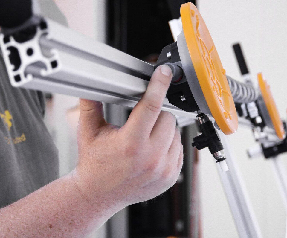 The S3 | Slim Slab Saver™ is a versatile, rigid frame and reinforcement tool that reduces strain and risk of injury while handling large format tile, glass panels and other fragile materials. It is an ideal tool for preventing breakage during transport and installation of LFTM (large format thin materials) including gauged or thin porcelain slabs, GPTP (gauged porcelain tile panels), large format floor tile, and sintered stone such as Neolith® or Lapitec®. This combination of solid machined clamps and extruded rails minimizes flexing and twisting of the material. The proprietary extruded aluminum rails are specially designed to be lightweight while retaining extreme strength and rigidity to provide reinforcement without adding a lot of weight to the material.