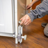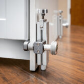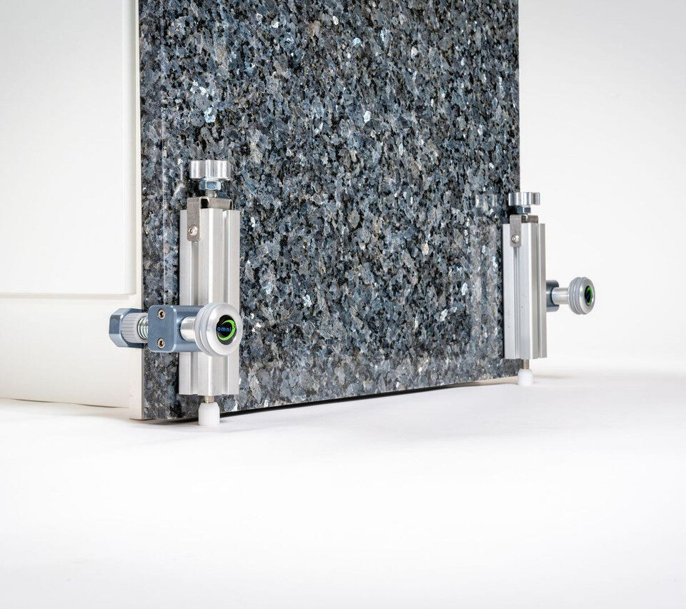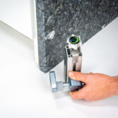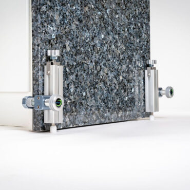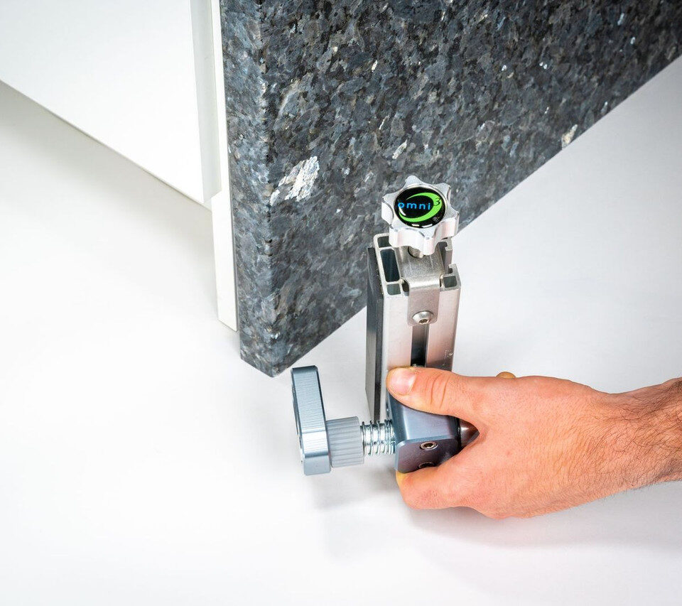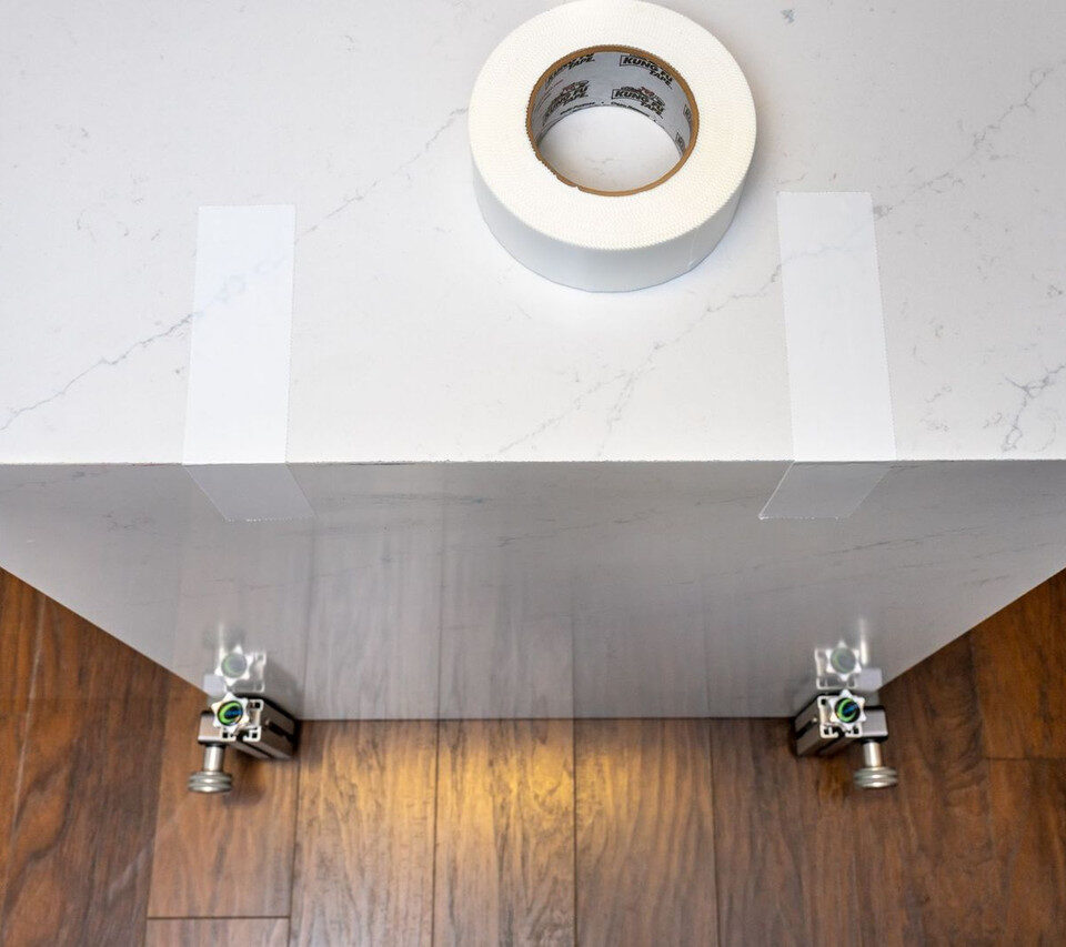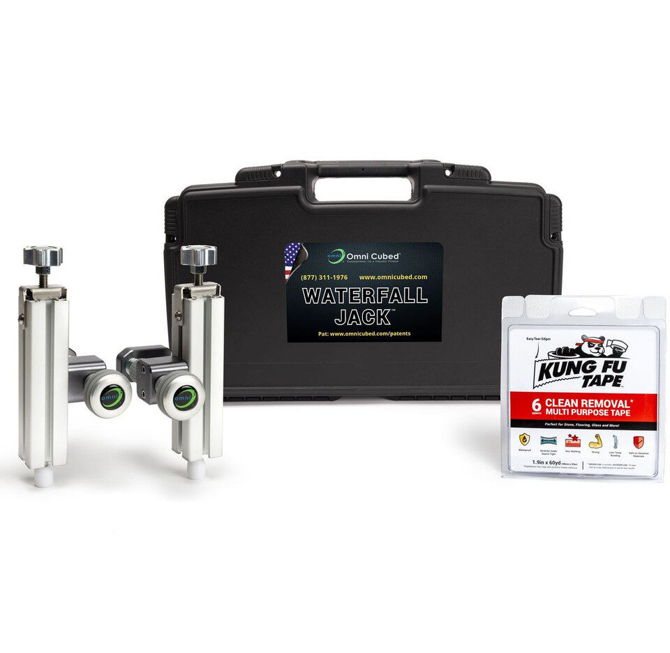 Effortlessly achieve the perfect waterfall edge installation with the Waterfall Jack™, a simple and innovative lifting tool that eliminates the need for shims, providing precise control over height and angle, ensuring a tight and even waterfall seam with ease and reliability, and it even includes a roll of Kung Fu Tape® for added convenience. Attach the built-in clamps to both sides of the waterfall edge and then adjust the top knobs to “dial in” and hold the stone at the perfect height and angle while the epoxy cures… It’s that easy! The Waterfall Jack™ is fast, easy, and offers greater precision and reliability than shims.